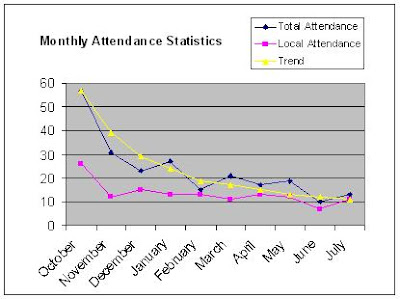 However, the fall in attendance from March to April was only 20%, which is an improvement on the most recent previous falls from November to December, which was over 25%, and from January to February, which was almost 50%. It might now be possible to speak of a statistical trend, if not an average attendance.