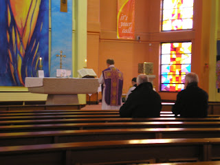 A sprinkling of snow earlier in the morning may well account for the smaller congregation. Besides Celebrant and server, 13 people were present for the Mass, not quite half the size of last month's congregation, although that number could be increased to 15, if the Parish's Sacristy Staff were to be counted. On the positive side, the local people attending were in a clear majority (as were the members of St. Conleth's Catholic Heritage Association, if that is noteworthy).
